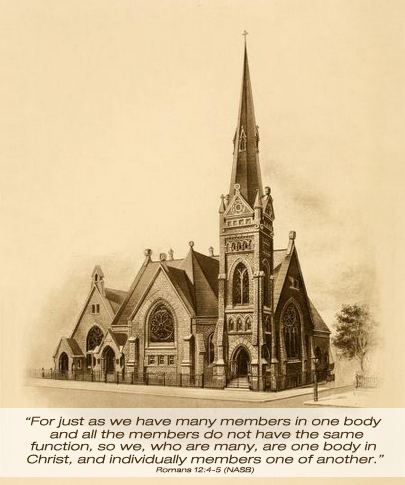 Description of Illustration: vintage church with steeple etching, monochromatic colors: navy, sepia, green, grey, and a reddish burgundy color, text is from Romans 12:4-5 "For just as we have many members in one body and all the members do not have the same function, so we, who are many, are one body in Christ, and individually members one of another." (NASB)