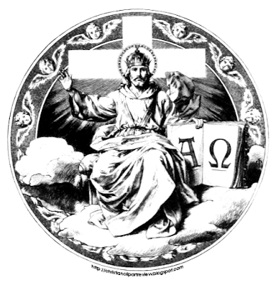 Description of the illustration: illustration of Jesus enthroned, crown, cross, cherubim, heaven's throne room, Alpha and Omega, I am the beginning and the end, Second Person of The Holy Trinity, liturgical colors: blue, green, red and gold, halo