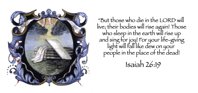 Description of Christian Clip Art: prophecy about the resurrection of the saints in Christ, medallion with the feet of Christ at the top raising from the empty tomb, clouds, O or medallion from an old manuscript, white background